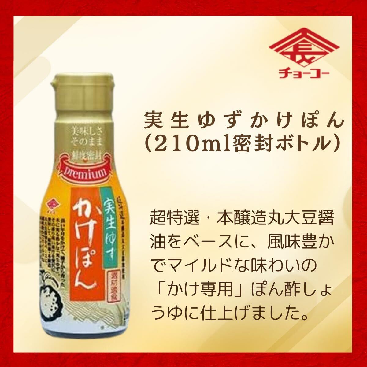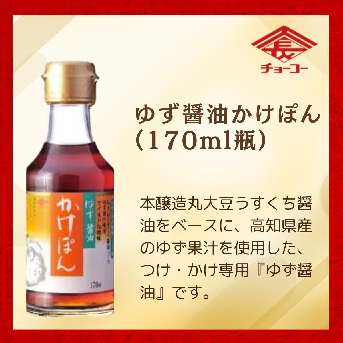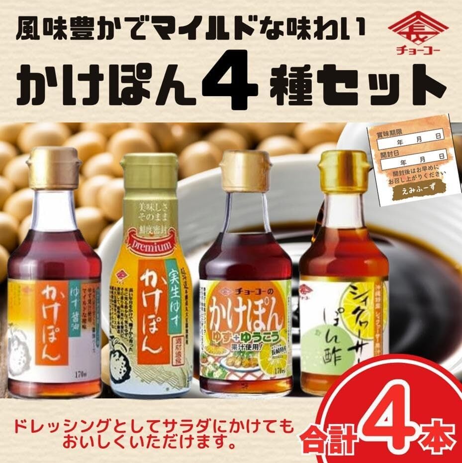 【ちょーこー醤油の大人気「かけぽん」シリーズを詰め合わせ】 **チョーコー醤油(ちょーこー醤油)**が誇る人気の「かけぽん」シリーズから、香り・風味・酸味の異なる4種を厳選してセットにしました。素材の味を引き立てるやさしい味わいで、毎日の食卓に彩りを添えます。 セット内容と特徴 ゆず醤油 かけぽん(170ml) 国産の香り豊かなゆず果汁を使用した、まろやかな酸味と旨味のある定番ポン酢。鍋料理はもちろん、冷奴や焼き魚にもよく合います。 実生ゆず かけぽん(210ml) 希少な国産・実生ゆずを贅沢に使用。上品で自然な酸味が広がり、ワンランク上の風味を楽しめる逸品です。野菜サラダや蒸し鶏にもおすすめ。 かけぽん(170ml) 酸味をおさえたやさしい味わいの万能ポン酢。小さなお子様や酸味が苦手な方でも食べやすく、しゃぶしゃぶや揚げ物にもぴったりです。 シィクヮーサー ぽん酢(かけぽん・170ml) 沖縄産シィクヮーサー果汁を使用した爽やかな香りのポン酢。さっぱりとした後味で、焼肉・餃子・冷しゃぶなどを爽快に仕上げてくれます。 【すべて化学調味料・保存料 無添加】 「チョーコー醤油」では、すべてのポン酢に無添加・国産素材を使用。自然な風味にこだわった身体にやさしい調味料です。 【使いやすいサイズで冷蔵庫にもスッキリ収納】 170〜210mlの手頃なサイズ感で、冷蔵庫のドアポケットにもすっきり収まり、お試し用やギフトにも最適です。 長い年月をかけて、種子から育った木に実る希少な「実生ゆず」。 その香り高い果汁を贅沢に使用して、超特選・本醸造丸大豆醤油をベースに、風味豊かでマイルドな味わいの「かけ専用」ぽん酢しょうゆに仕上げました。 ・かけぽん170ml チョーコーの看板商品かけぽんが、大地の恵みと長崎の歴史がぎゅっと詰まった長崎特産ゆうこうの果汁を新たに加えてリニューアルしました! 本醸造うすくちしょうゆをベースにゆず果汁と長崎県産ゆうこう果汁を使って香り豊かに仕上げた、マイルドな味わいのぽん酢しょうゆです。 透明感のあるうすいろタイプですので、お料理の色を損なう事なく美味しさを際立てます。 ・シィクヮーサーぽん酢 沖縄特産シィクヮーサー果汁100%使用 本醸造丸大豆うすくち醤油をベースに、沖縄特産のシィクヮーサーの果汁を使い、風味・香りを損なわないように仕上げました。お刺身・和え物など、または、ドレッシングとしてサラダにかけてもおいしくいただけます。