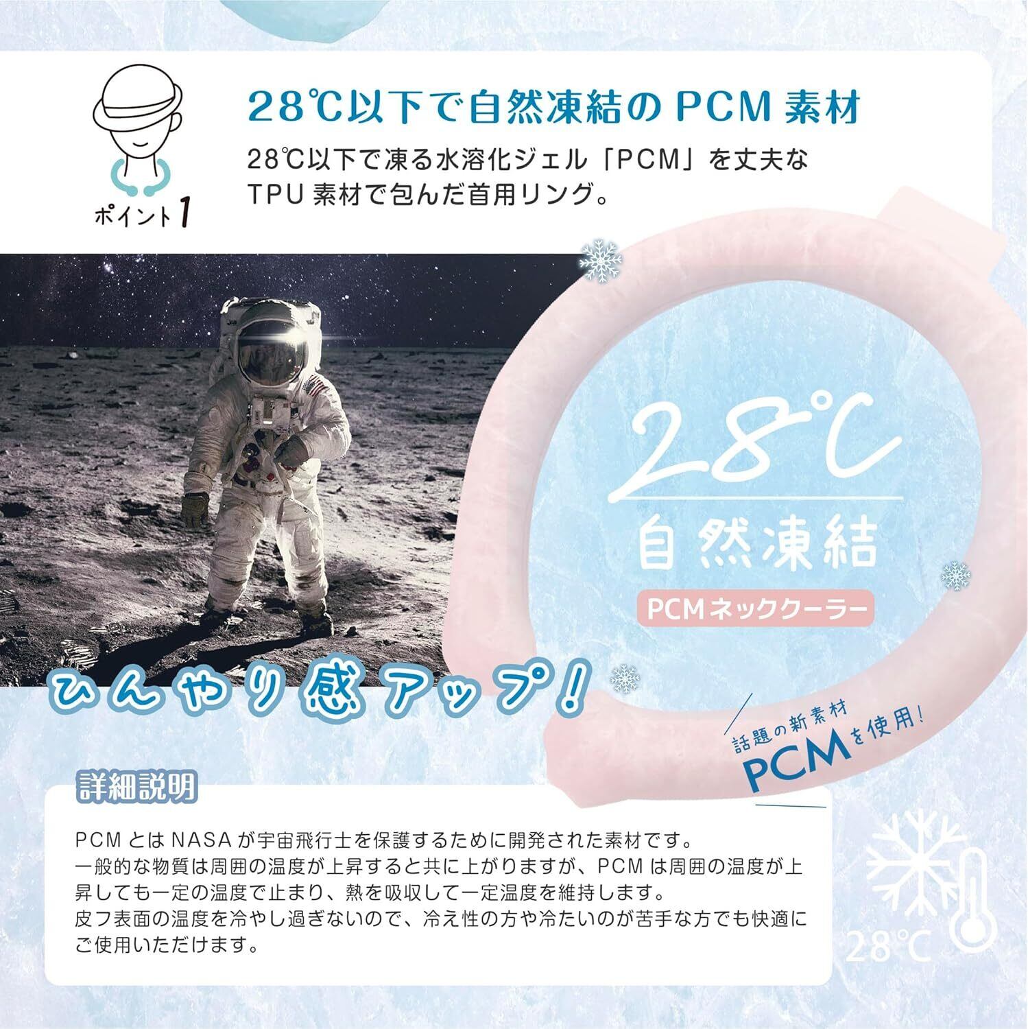 28℃以下で自然に凍る!電源不要の次世代冷却ネックリング 夏の暑さ対策にぴったりの「28℃ネックリング」は、水溶化ジェル「PCM(Phase Change Material)」を内蔵し、28℃以下の環境で自然に凍結します。冷凍庫に入れなくても、エアコンの効いた部屋や冷水などで冷やすだけで、すぐにひんやり感を得られます。特別な冷却装置や電源は一切不要で、アウトドア・通勤・お子様の通学など、あらゆるシーンで手軽に使える経済的かつエコな熱中症対策アイテムです。